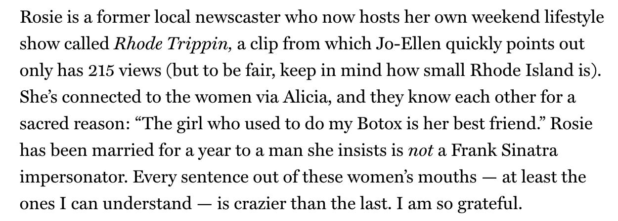 My take: there is real potential here! The women know one another in real life and have long-held grudges, there is a blatant personality disorder amongst the cast (Jo-Ellen), as well as a sugar baby for a man who is the son of TV-famous judge who I grew up watching with my grandmother. This is a rich, rich text, and I was delighted to see one of my favorite short humor writers, Tom Smyth, recapping the series for Vulture:
